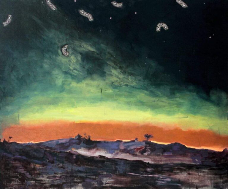 Há algum tempo acompanho com interesse a descrição das luzes artificiais na pintura de Letícia Lopes. Em cenas predominantemente noturnas, esses trabalhos são construídos primeiro pelas camadas de cores claras — uma paleta em que o cruzamento de tons ácidos e outros pastéis gera uma vibração similar a de lâmpadas fluorescentes —, para depois serem recobertos pelos azuis ou verdes profundos, mas especialmente pelo preto. Os trabalhos são baseados em fotografias e a imagem espectral decorrente deste procedimento pictórico sugere um mundo de fantasmagorias que se multiplicam e são transferidas de uma materialidade a outra.